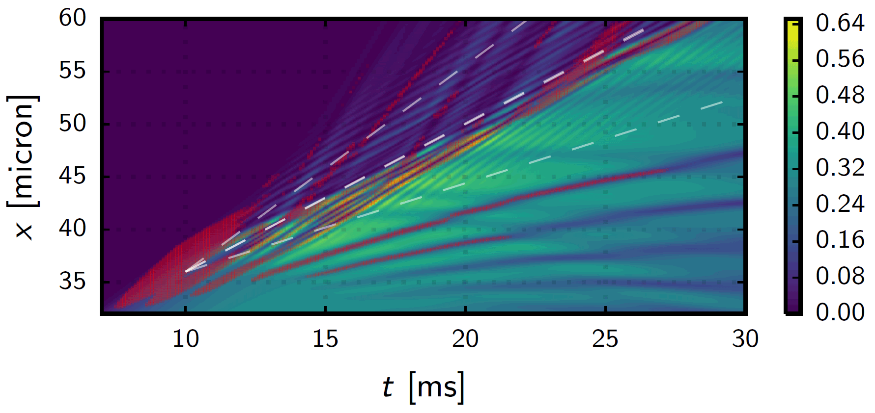 The lower diagram shows a one-dimensional simulation of the total density as a function of time in a region where dynamic instability first appeared. The dashed lines are divided into three groups of atoms with velocities
