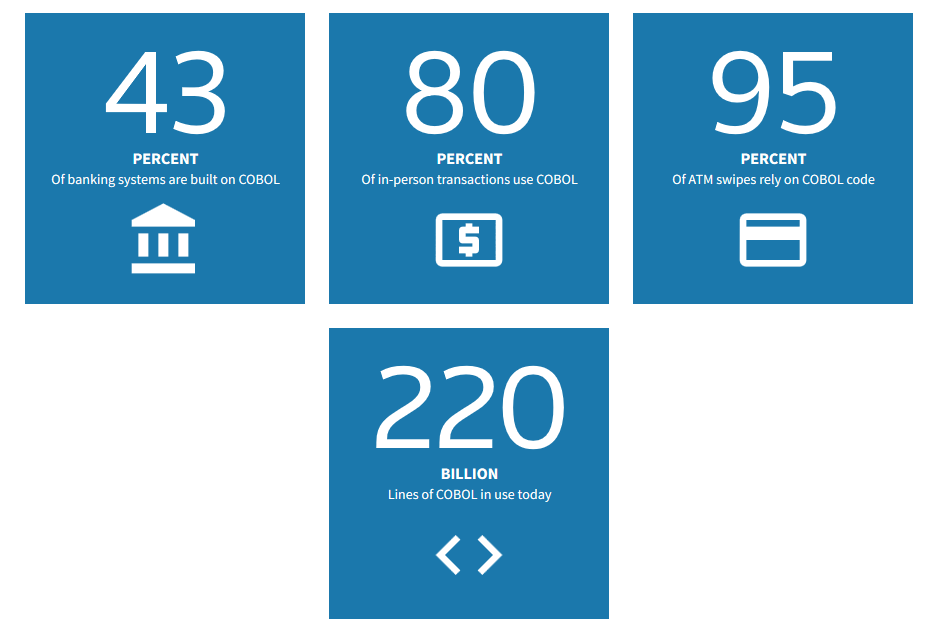 Yes, it was replaced in many areas by new programming languages, Java, C, Python. But the hardware and software platforms, developed then, are working now. Of course, they are modified and quite in line with the spirit of the times, but the basis has remained the same. In the US, for example, the financial sphere largely depends on such systems that were created in the 70’s and 80’s. Here is a small infographics that can surprise many.