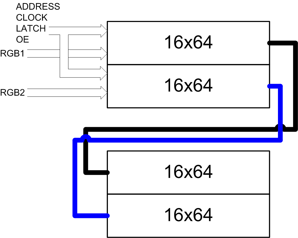 But then why not two lines, and four? It turns out that the matrix 64×64 consists of two independent matrices 32×64. It would be possible to connect separate outputs of the processor to each, but ATmega328 does not have enough of them. Fortunately, the caring manufacturer has provided cascading of these matrices – the output of the shift register one can be connected to the input of the other. Then we get the logical matrix 32×128, which is physically displayed as 64×64. That is, in each phase, we need to push two lines of 128 pixels into the registers – and this is 4 lines of the physical screen.