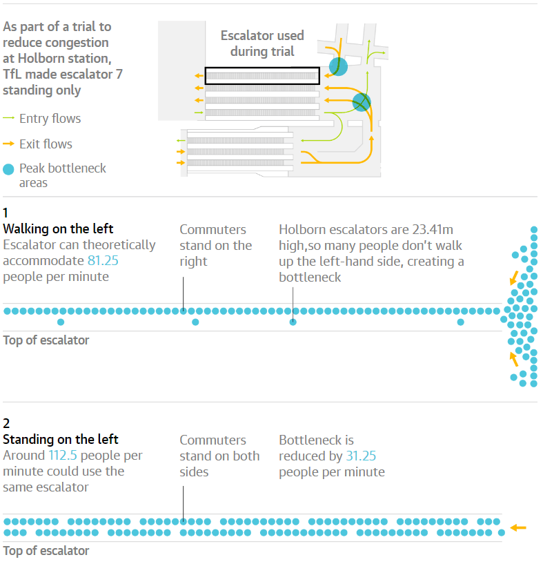 The experiment at Holborn Station fully confirmed the results of the simulation: the passenger flow on the double-row escalator was significantly higher. During the hours of the experiment, the escalator carried 16,220 passengers per hour instead of the standard 12,745. Nevertheless, people took the bayonets of the employees who directed the traffic. In the first three weeks, as soon as he was not called an experiment: “terrible”, “crazy”, “idiotic”, “funny” and “very bad idea”. 18 people called him “stupid”. The employee who organized the movement on the escalator to Holborn said that one of the passengers even showed him the middle finger.