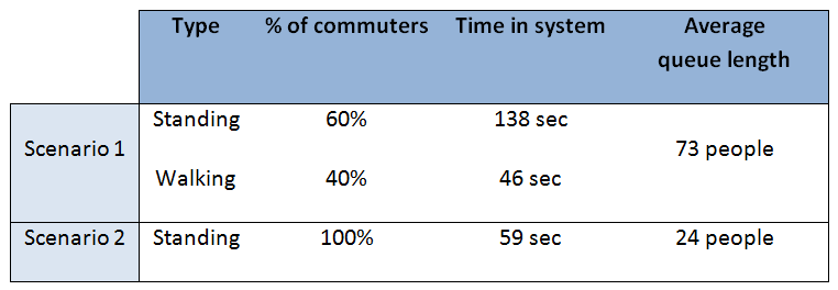 Then, a simulation of two different Scenarios. In the first scenario, the “real situation” was described, when 60% are on the escalator, and 40% are on. And in the second scenario both rows of the escalator were occupied by standing passengers. It was found out that in the first case the waiting and lifting time for standing and walking passengers took 138 and 46 seconds, respectively. And in the second case – 59 seconds for everyone. That is, for 60% of passengers, the lifting time is reduced by 79 seconds, and for 40% of passengers – increases by 13 seconds. The average turn before the escalator is reduced from 73 to 24 people.