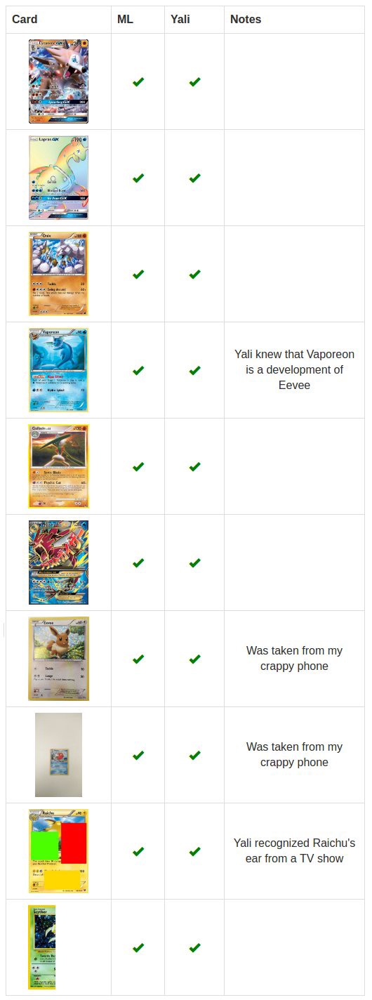 I asked Yali about how he recognized the cards, and he told me that he saw some Pokémon in TV shows or books. This is how he recognized Raichu’s ears or learned that Vaporone is the watery Ivi. My program did not have such data, only maps.