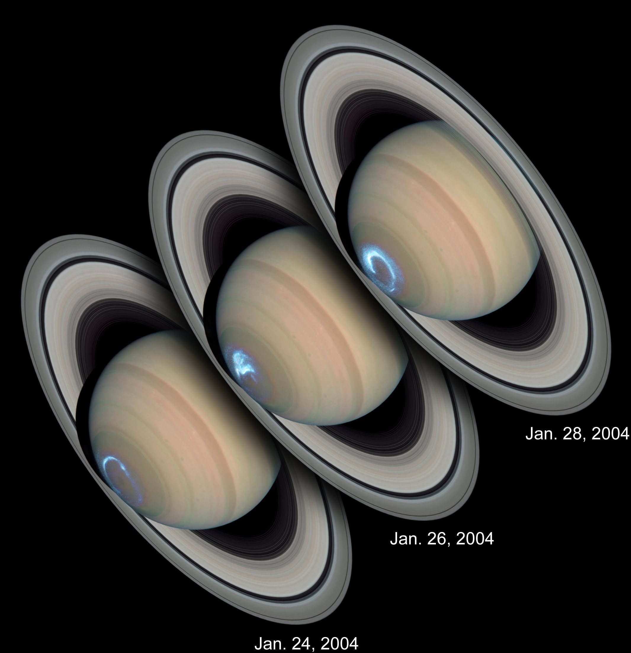Polar lights on Saturn, combined shot in the ultraviolet and visible light (Hubble Space Telescope) Nasa