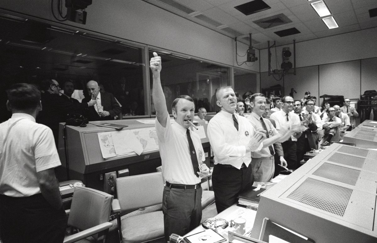 The NASA Control Center celebrates the successful splashdown of Apollo 13 in 1970