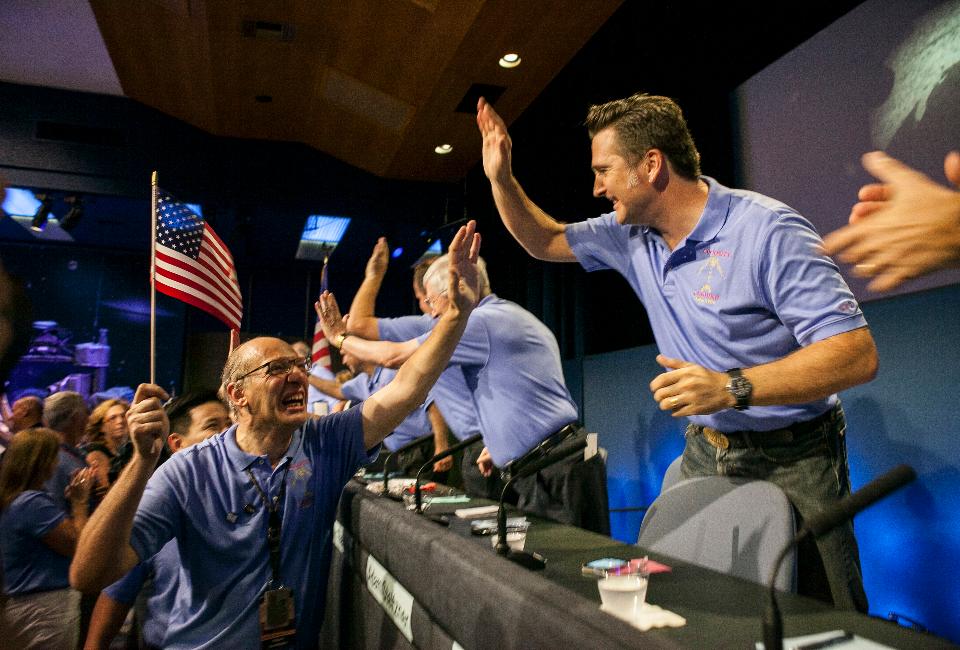 The NASA Scientific Laboratory Team Celebrates the successful landing of the rover Curiosity, 2012