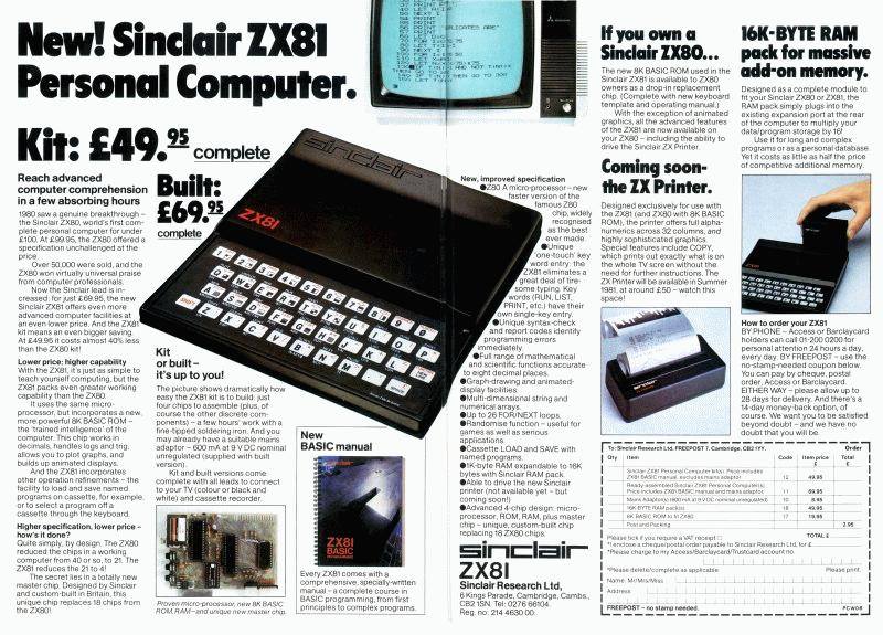 In 1981 there was a new model, which was named ZX81. It was supplied in the form of a “designer”, from which it was possible to assemble a computer, and a ready-made system. The cost of the first option was 49.95 pounds sterling, the second – 69.99. It was slowly started selling not only by mail, but also in retail chains. As for the processor, it used the same Z80 with a core clock speed of 3.25 MHz. The RAM was the same as the previous model – 1 KB, which was not liked by many. But the ROM volume has already grown up to 8 kilobytes. In this model, the video controller also did not exist. Sales of new items exceeded sales volumes of ZX80 several times.